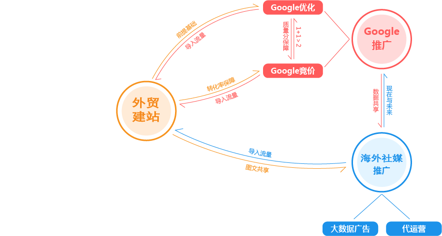 商丘外贸推广公司为您提供全面的“整合”方案,为您的企业提供全生命周期的精细化服务和咨询。为此,我们搭建了从广告投放到SEO优化,从内容运营到网站开发,从品牌策划到电商运营的近100人的团队,组成了一家集全球渠道资源、人才资源、技术资源为一体的数字营销机构,为您一站式解决出海难题,实现品牌全球推广!
